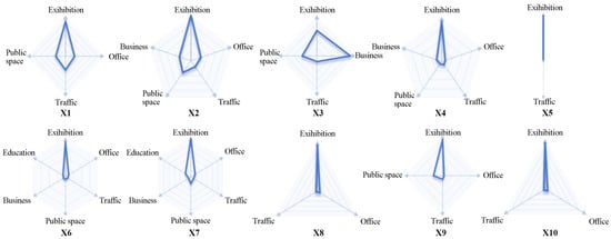 In the expert post-evaluation, greater emphasis is placed on the “adaptability and efficiency of building reuse” (A21), whereas visitors tend to prioritize the “flexibility and efficiency of building reuse” (A23). This divergence stems from the experts’ focus on design considerations, in contrast to the public’s greater concern for spatial perception. Furthermore, an analysis of the functional composition of the ten renovated buildings reveals that venues with a more diverse range of functions, such as the B10 Hall and Kinwei Brewery, are more popular, as shown in Figure 7. However, in practice, many renovation projects primarily concentrate on the layout of exhibition halls, often neglecting the integration of complementary functions. This imbalance leads to a lower level of functional completeness in the final design.