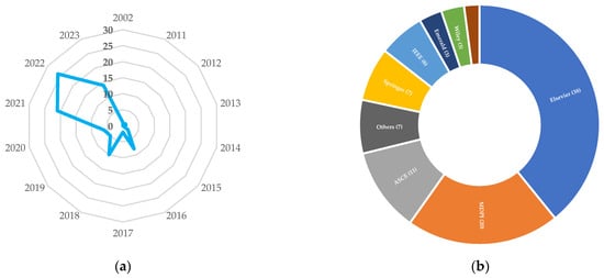 Articles related to AI and ML in the built environment by year and publisher (source: developed by authors based on [5]). (a) Mapping articles connected to AI and ML by year, (b) Articles associated with AI and ML by publisher.