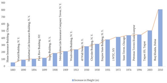 Due to urbanization and space usage, skyscrapers cropped up in the late 19th century. While the early structures considered gravity loads, subsequent buildings included lateral loads such as wind and earthquakes. In the 1890s, European cities disdained TBs. The Chrysler Building, 1930, and the Empire State Building, 1931, were the world’s tallest skyscrapers built in New York City. Skyscrapers are designed and keep evolving with technological development, cultural changes, and concern for the environment. Louis Sullivan, John Wellborn Root, and George B. Post reimagined skyscrapers as purer architectural types that symbolize the spirit of modern progress, at the same time evoking historical connections, especially in the United States [25]. There are three generations of skyscrapers; each one has its own character and way of construction. The three generations are classified as follows: (a) First Generation 1780–1850: At this time, the buildings consisted of stone or brick, and sometimes cast iron was added for decorative purposes. (b) Second Generation 1850–1940: Frame structures, with a skeleton of welded or riveted steel columns and beams. (c) Third Generation 1940–present: Buildings constructed after World War II until today constitute the most recent generation of high-rise buildings, with reinforced concrete construction and steel-framed reinforced concrete construction [21]. At the beginning of the 20th century, architects began working on more elaborate designs that included a wide use of detailing and decoration. When the Woolworth Building was completed in 1913 in New York City, it became a great example with its neo-Gothic style, complex carvings, and soaring spire. Other notable examples from that time were the Chrysler Building and the Empire State Building, in which sleek Art Deco designs merged with technology, creating some of the most iconic buildings in the world [25]. Table 3 lists the development of the architectural style of skyscrapers, while Figure 3 illustrates the development in height over the years.
