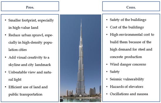 Pros and cons of skyscrapers, developed by authors (Image’s credit and source: Donaldytong, https://en.wikipedia.org/wiki/Burj_Khalifa#/media/File:Burj_Khalifa.jpg (accessed on 26 December 2024)).