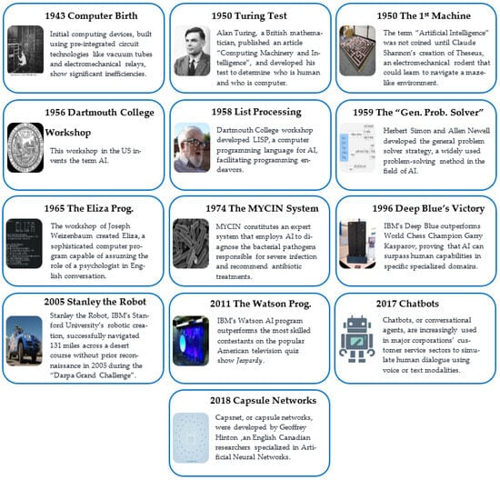 A brief history of AI evolution through the years (image source: developed by authors after Hello Future, 2022, [31]; (Image’s credit and source: M. Weik. https://commons.wikimedia.org/wiki/File:ENIAC-changing_a_tube_(cropped).jpg (accessed on 16 February 2025)). (Image’s credit and source: Elliott & Fry. https://en.wikipedia.org/wiki/Alan_Turing#/media/File:Alan_Turing_(1951).jpg (accessed on 16 February 2025)). Image’s credit and source: Osamu Iwasaki. https://en.wikipedia.org/wiki/Micromouse#/media/File:Micromouse_maze.jpg (accessed on 16 February 2025)). (Image’s credit and source: Dartmouth College. https://en.wikipedia.org/wiki/Seal_of_Dartmouth_College#/media/File:Seal_of_Dartmouth_College.png (accessed on 16 February 2025)). (Image’s credit and source: null0. https://en.wikipedia.org/wiki/John_McCarthy_(computer_scientist)#/media/File:John_McCarthy_Stanford.jpg (accessed on 16 February 2025)). (Image’s credit and source: MrunaltPatel. https://commons.wikimedia.org/wiki/File:Simons_3_stages_in_Decision_Making.gif (accessed on 16 February 2025)). (Image’s credit and source: Unknown author. https://en.wikipedia.org/wiki/ELIZA#/media/File:ELIZA_conversation.png (accessed on 16 February 2025)). (Image’s credit and source: NIAID. https://en.wikipedia.org/wiki/File:E._coli_Bacteria_(7316101966).jpg (accessed on 16 February 2025)). (Image’s credit and source: James the photographer. https://en.wikipedia.org/wiki/Deep_Blue_%28chess_computer%29#/media/File:Deep_Blue.jpg (accessed on 16 February 2025)). (Image’s credit and source: https://en.wikipedia.org/wiki/Deep_Blue_%28chess_computer%29#/media/File:Deep_Blue.jpg (accessed on 16 February 2025)). (Image’s credit and source: Clockready. https://en.wikipedia.org/wiki/IBM_Watson#/media/File:IBM_Watson.PNG (accessed on 16 February 2025)). (Image’s credit and source: www.freepik.com/free-vector/illustration-robot_2606096.htm#fromView=keyword&page=1&position=2&uuid=1fe57a5f-8ed5-4f45-973e-ee6aeea3f46a&query=Chatbots+Icon (accessed on 16 February 2025)). (Image’s credit and source: https://www.freepik.com/free-vector/circle-with-triangles-background_723422.htm#fromView=search&page=1&position=2&uuid=5df70b94-ca1e-4979-8aa7-2239dc59ac8c&query=Capsule+neural+network (accessed on 16 February 2025)).