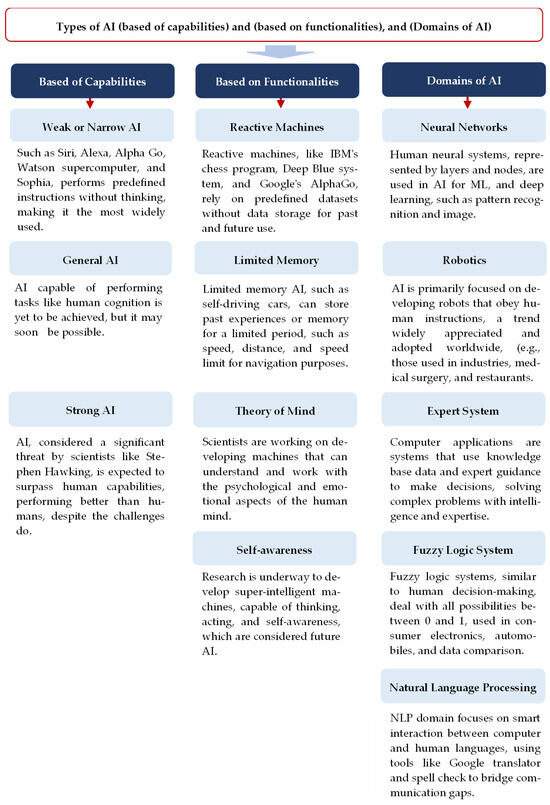 AI is a domain of mathematics, biology, philosophy, psychology, neuroscience, statistics, and computer science combined, the main objective of which is to develop transparent and interpretable systems for intelligent agents. Figure 5 illustrates the evolution of AI [30], while Figure 6 shows the types of AI based on capabilities and based on functionality, as well as different domains of AI. Moreover, AI often relies on heuristics, which are like “quick tips” for solving problems. These guidelines help tackle complex problems that simple algorithms cannot easily solve. They often incorporate human expertise, particularly when using sophisticated AI approaches.