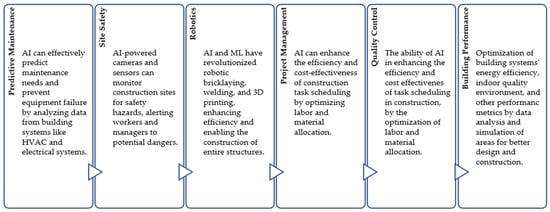 Additionally, AI has the ability to enhance creativity and precision with generative design tools that improve sustainability and quality; moreover, Virtual Reality (VR) and Augmented Reality (AR) tools aid client visualization and decision making, leading to more advanced architectural projects’ delivery by automation and a reduction in errors. Moreover, the utilization of BIM-AI throughout the construction project lifecycle is apparent in Additive Manufacturing (AM), 3D Printing (3DP), Blockchain Technology (BCT), Just in Time (JIT), computer vision (CV), Unmanned Aerial Vehicles (UAVs), the Internet of Things (IoT), Radio Frequency Identification (RFID), Big Data Analytics (BDA), Digital Material Passports (DMPs), and Data Platforms and Banks (DP&Bs) [15,16].