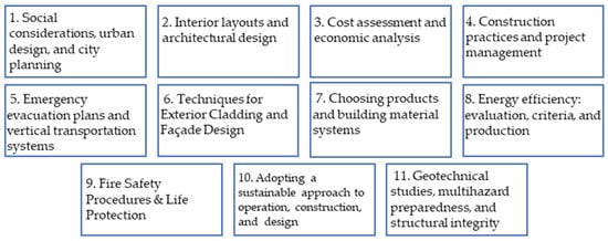 Facing these challenges by architectural solutions includes the following: (a) vertical urban development by constructing TBs and skyscrapers to maximize land use and building mixed-use vertical communities to be sustainable; (b) sustainable design strategies via green building design technologies, the integration of renewable energy and different passive cooling and heating systems, and recycled and sustainable building materials; (c) smart building technologies implementing AI-driven building management systems, adaptive environmental control, real-time energy optimization, predictive maintenance, and an enhancement in occupants’ comfort and well-being; (d) modular and prefabricated construction to reduce construction times, lower costs, improve quality control, and minimize on-site waste, as well as flexibility in design and adaptation; (e) resilient and adaptive architecture that helps in facing climate change, flexible spatial configurations, multifunctional spaces, self-healing materials, and climate-responsive architectural designs; (f) technological integration by applying Internet of Things (IoT) infrastructure and integrating advanced sensors and monitoring systems, data-driven design optimization, and enhanced building performance analytics; and (g) social inclusion and community design via inclusive architectural spaces, accessible design, community-centric urban planning, shared spaces and amenities, and promoting social interaction [8,9].