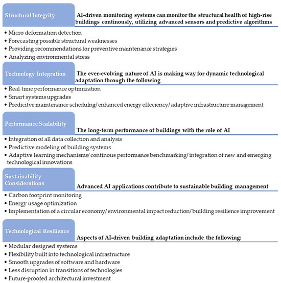 In addition, a comparative analysis is conducted to examine four main key aspects, namely (a) environmental impact, with subheadings such as energy consumption analysis, materials usage, sustainability assessment, and carbon footprint; (b) efficiency, with subheadings such as planning and construction, cost efficiency, design speed, optimizations, predictive capabilities, error detections, structural analysis, material selection, and documentation; (c) human-centric performance, with subheadings such as occupants’ comfort, safety and security, maintenance and operation, risk assessment, and safety planning; and (d) long-term impact, with subheadings as building longevity, future adaptability, and building performance quality control.
