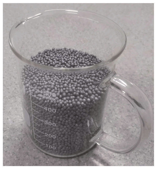 The GCIM is mainly composed of four primary materials: graphite polystyrene particles (GPPs), glass microspheres (GMs), cement, and silica fume (SF) [31,32,33]. It has excellent insulation performance and can meet Class A fire protection requirements, making it widely used in the field of external wall insulation in buildings. GPPs are the main insulating aggregate in the GCIM. As shown in Figure 2, the GPPs are spherical after foaming treatment, with a size ranging from 1 to 5 mm, gray in color, and characterized by low TC and good fire resistance. GMs, as an additive material, primarily enhance the compressive strength of the material. Additionally, they have a low TC, ranging in size from a few micrometers to several hundred micrometers. The inclusion of cement and SF serves a dual purpose: acting as a binder and improving the overall mechanical performance and durability of the insulation material.