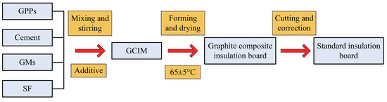 The GCIM is composed of four main components. These four raw materials are mixed with water at room temperature, and additives are added to form insulation aggregates. The mixture is then shaped using molds and placed in a drying machine until it reaches the required strength, after which it is cut to the desired dimensions. The specific processing workflow is illustrated in Figure 3.