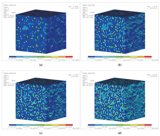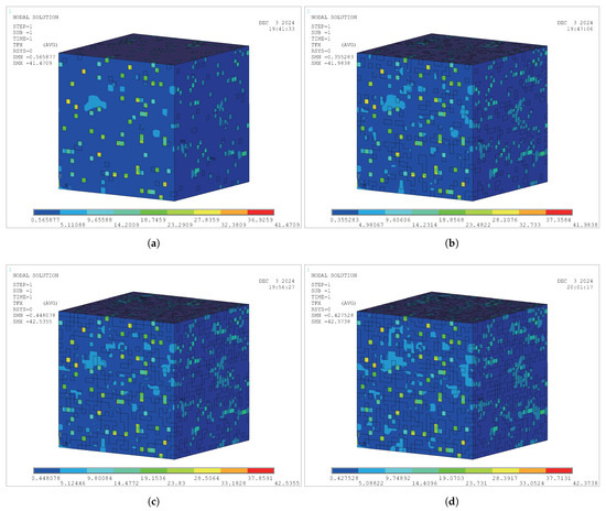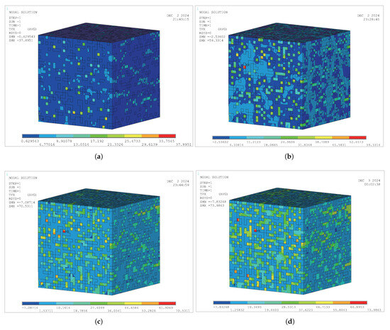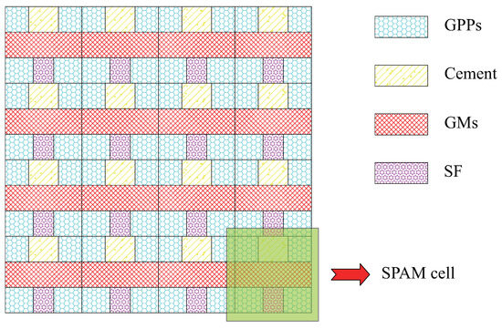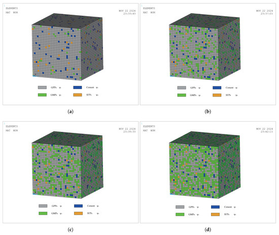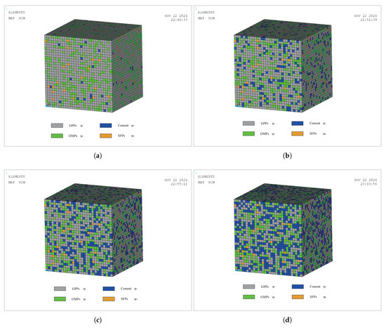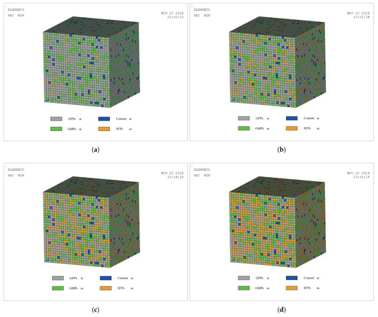According to the material assignment algorithm in Figure 8, material VR models for three modes have been established, i.e., the GPP-cement VR model (), the GPP-GM VR model (), and the GPP-SF VR model (). For the three mode models, based on different material VRs, 20 sets of FE models with different material VRs are established for each mode. The typical representative models for each mode are shown in Figure 9, Figure 10, and Figure 11, respectively.