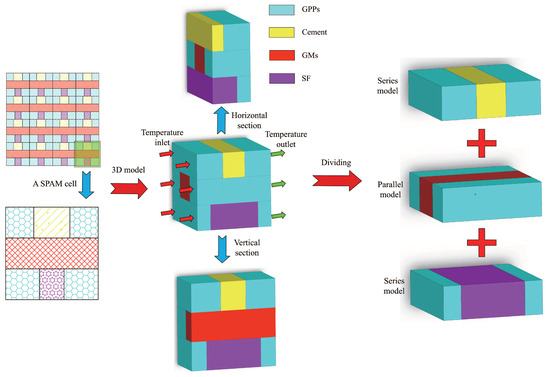 The temperature difference exists on the surface of an object, and heat transfer will occur [34]. According to the thermal conduction theory, the equivalent TC of composite materials is not affected by the unit volume [31]. Consequently, the theoretical model can be based on a single unit cell for computation. The theoretical heat conduction model of the GCIM can be considered as a combination of four component materials. Based on the traditional heat conduction model, the SPAM is established, as shown in Figure 4.