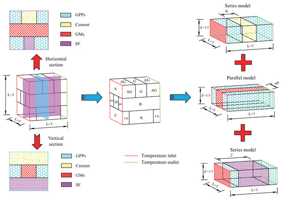 In the heat conduction model in Figure 6, the thermal theoretical calculation unit is a cube with a side length of . This cube is composed of three primary sub-heat conduction units, A, B, and C, each with a thickness of . The primary heat conduction sub-units A, B, and C are comprised of secondary matrix material sub-units and secondary inclusion material sub-units. GPPs serve as the matrix material, with a volume fraction of . Cement, GMs, and SF act as inclusion materials, with volume fractions of , , and , respectively. The key dimensions of the secondary inclusion material sub-units are , , and ; according to geometric relationships, it can be obtained that