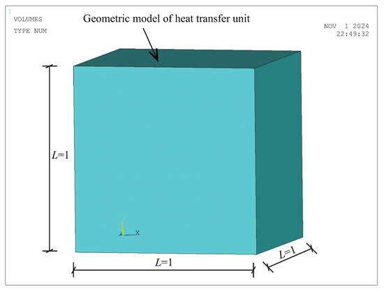 SOLID70 is an 8-node three-dimensional heat conduction element that can simulate heat conduction in the x, y, and z directions, achieve uniform heat transfer, and is applicable for steady-state heat conduction analysis of the GCIM. The accurate establishment of the FE model directly determines the correctness of the numerical simulation results. Based on fundamental assumptions, a cubic unit cell three-dimensional geometric model of the GCIM is established for FE simulation calculations, as shown in Figure 7.
