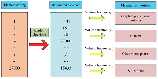 In the cubic geometric model of Figure 7, with a side length , the solid cube is divided into a mesh using SOLID70 elements, with each edge segmented into 30 sections. The cubic geometric element is subdivided into 27,000 elements and numbered sequentially. Based on the VRs of the four materials in Table 1, the number of elements for each material is determined. A Python random model algorithm is used to assign material properties to mesh elements in sequence for the four materials, following the specific material assignment process shown in Figure 8.