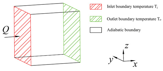 The boundary conditions of the thermal FE model are set as shown in Figure 12, with heat being transferred in the x-direction. The temperature at the inlet boundary is , and at the outlet boundary, it is . The remaining four faces are adiabatic boundaries. In order to facilitate the calculation of the material’s TC, the temperatures at the inlet and outlet are set such that . The FE analysis adopts a steady-state analysis, using a direct sparse solver. During the calculation, the convergence of the analysis is automatically checked based on temperature and heat flux density, ultimately obtaining the steady-state results. Through FE analysis, the heat flux density at each node in the computational model is obtained. Subsequently, the average heat flux density of the model is calculated, and by utilizing Equation (44), the TC of the model can be determined. Furthermore, the FE results were compared with theoretical and test results.