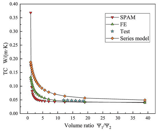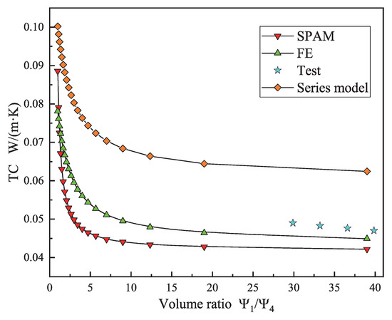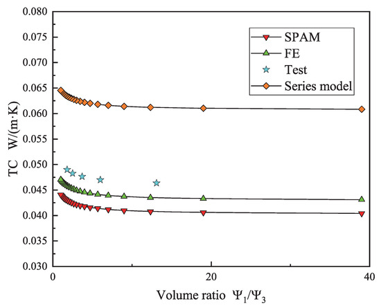 The VRs of the four material components in the GCIM directly affect their TC calculation results. A total of 60 theoretical analyses and numerical simulations were conducted on three models. The calculation results of SPAM are compared with the results of the traditional series model, FE model, and sample test [31,32,33]. The influence of material VR on the TC of the three models is obtained, as shown in Figure 16, Figure 17 and Figure 18.
