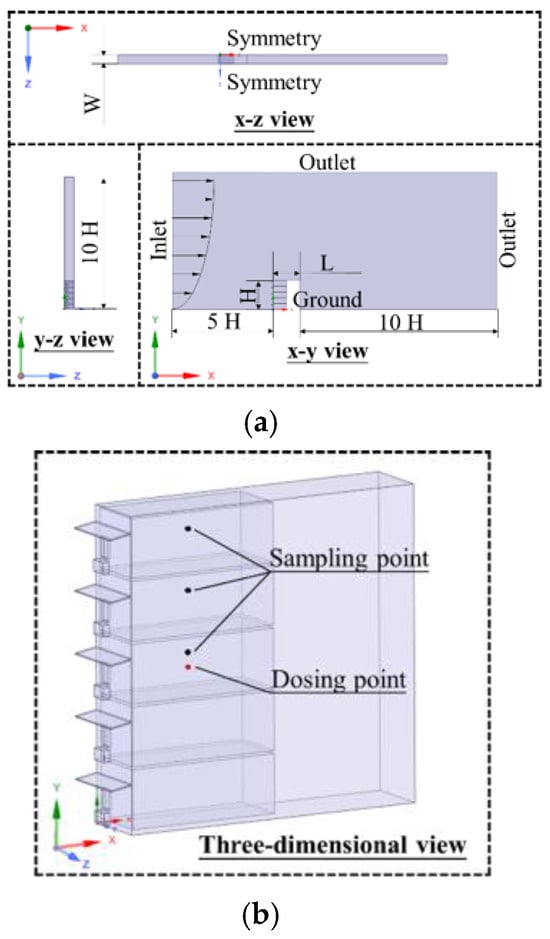 The building geometry model setup for the CFD simulation: (a) Computational domain; (b) building model.