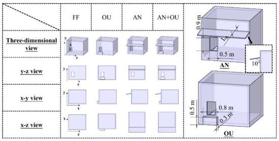 This study took into account four different façade configurations: flat façade (FF), façade with only outdoor units (OU), façade with only 1 m-long awnings (AN), and façade with both outdoor units and 1 m-long awnings (AN + OU) (Figure 2). Each room had a window measuring 0.5 m × 0.9 m, and this window remained fully open during the simulation. The outdoor unit was installed directly beneath the window, with its dimensions being 0.8 m × 0.3 m × 0.5 m. The width of the awning was equal to that of a single room (3 m), and it had a certain overhang length . In the simulation, varied between 0.5 m and 1.5 m, and the awning formed an angle of 10° with the horizontal plane.