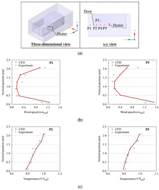 In Experiment 1, the two chambers represent the indoor and outdoor environments, respectively (Figure 3a). The buoyancy-driven natural ventilation was generated by a heater inside the laboratory, with a rectangular opening opposite the heater. There were five measurement points (P1–P5) inside and outside the laboratory to measure the wind speed and temperature. The experimental data from two points (P2 and P5) were used for the validation of the computational fluid dynamics (CFD) model. Figure 3b,c compares the predicted velocity and temperature curves with the experimental data from P2 and P5. As shown in the figures, the velocity and temperature curves matched the experimental data well. Therefore, this provided an acceptable reference for the airflow and temperature distribution of the computational fluid dynamics (CFD) model of the buoyancy-driven natural ventilation.