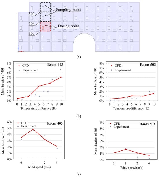 Comparison of the CFD-predicted tracer gas mass fractionwith the experimental data. (a) Schematic of the field-tested building; (b) the effect of indoor–outdoor temperature difference on the tracer gas mass fraction in the receptor rooms (403 and 503); (c) the effect of outdoor wind speed on the tracer gas mass fraction in the receptor rooms (403 and 503).