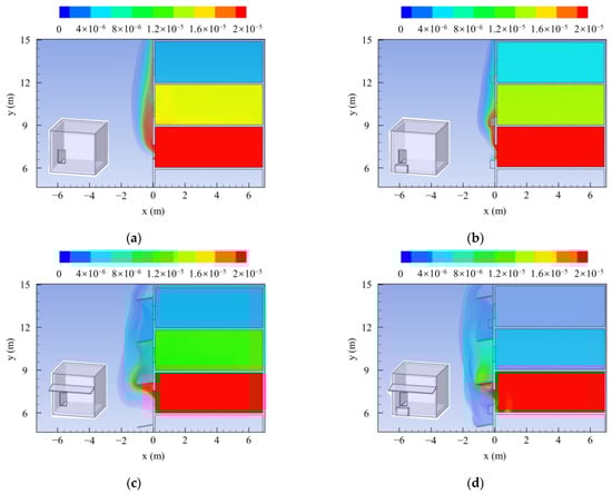 Tracer gas concentration distribution under different external wall attachments. (a) FF, (b) OU, (c) AN, (d) AN + OU.