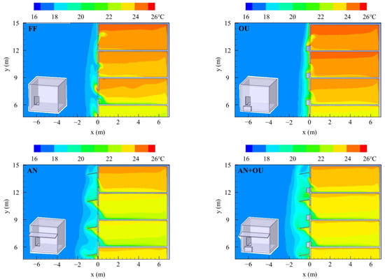 In order to gain a better understanding of the impact of different attachments on inter-flat pollutant transmission, Figure 7 illustrates the heat flux distribution in the central z-plane for various attachment types. As Shown in Table 2, rooms with the flat facade (FF) and outdoor unit (OU) attachments generally had relatively higher average temperatures, while the average temperature under the awning (AN) condition was relatively lower. The awning + outdoor unit (AN + OU) type featured more uniform average temperatures across different floors. When there are no attachments on the external wall (FF), natural wind can flow relatively smoothly, leading to a more balanced temperature distribution without overly high temperatures. The outdoor unit (OU) type had an impact on the air changes per hour. By observing the airflow direction at the windows, it was noted that the presence of the outdoor unit hindered cold air from entering through the lower part of the window, thus influencing the overall temperature distribution within the room. Compared with the OU scenario, in the AN scenario, the awning blocked some of the hot air from the lower rooms, thereby reducing the increase in indoor temperature. The AN + OU type was more complicated, since its temperature distribution was affected by both the awning and the outdoor unit. This may either lower the temperature due to the blockage of vertical airflow or raise it because of the impact of the outdoor unit on indoor ventilation. Therefore, its average temperature lay between that of AN and OU. All in all, due to the unique shape and function of the awning, the AN type of building could effectively block pollutants coming from below while maintaining a relatively high air change rate (ACH), thus providing a relatively clean air environment indoors.