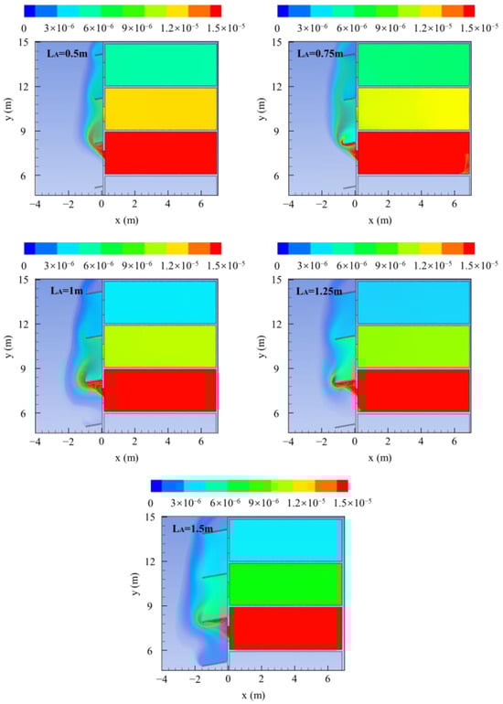 When selecting an awning length of 0.5 m, the tracer gas mass fraction in the receptor room was higher than that in the FF-type building (Figure 8. A shorter awning leads to a smaller area of airflow dispersion at the external wall, which increases the concentration mass fraction of pollutants in the airflow entering the upper-floor rooms. As shown in Table 4, when the awning length was 1 m, the tracer gas mass fraction in the receptor room decreased by 27.6% (on the fifth floor) and 33.2% (on the fourth floor) compared with the 0.5 m awning. When the awning length was 1.5 m, the tracer gas mass fraction in the receptor room decreased by only 10.2% (on the fifth floor) and 11.1% (on the fourth floor) compared with the 1 m length. Further increasing the awning length had a limited effect on reducing the infection risk. In summary, an awning length of 1.0 m is most suitable.