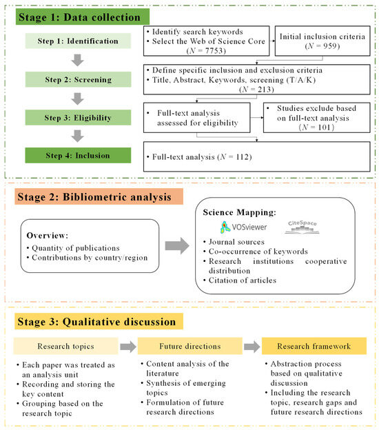 As shown in Figure 1, this review approach is divided into three parts: (1) data collection, (2) bibliometric analysis, and (3) qualitative discussion.