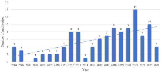 Figure 2 illustrates that research into MCWs experienced steady growth from 2004 to 2024, which can be divided into two phases: a slow growth phase (2004–2013) and a rapid growth phase (2014–2023), culminating in a peak of 14 publications in 2021. This trend suggests that research into MCWs is expected to keep expanding in the future. The increased attention can be attributed, in part, to the SDGs introduced by the United Nations in 2023, particularly SDG 3, SDG 8, and SDG 10, which aim to promote a more sustainable and inclusive work environment [32].