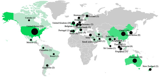 A total of 307 authors from 30 countries across 5 continents are involved in this field (Figure 3). Asia emerges as the most representative region, contributing 31.8% of the papers, followed by Europe as the second most represented region, contributing 28.1%.