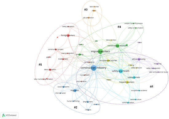 These clusters provide a comprehensive overview of key research areas related to MCWs. Cluster 1 (#1) focuses on labor market segmentation and labor migration, addressing issues such as security measures from trade unions, integration challenges, and power imbalances affecting MCWs. Cluster 2 (#2) examines social networks and diversified employment, highlighting employment challenges, opportunities, and the impact of social networks on worker rights. Cluster 3 (#3) investigates job satisfaction and the labor market, exploring innovative evaluation tools. Cluster 4 (#4) addresses precarious employment faced by MCWs, analyzing control mechanisms and the effects of bilateral agreements. Cluster 5 (#5) focuses on safety and health, studying strategies for adapting safety systems to multicultural environments and examining the role of safety climate in influencing worker behavior and reducing accidents.