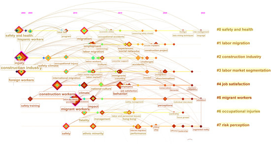 A timeline view based on keywords was developed to capture the evolution of research focus over time (Figure 6). The analysis indicates that research into various aspects of MCWs, such as safety, health, job satisfaction, occupational injuries, social networks, and risk perception, has expanded significantly over time. Examination of clustered nodes reveals that current studies emphasize the physical health of MCWs and their mental health and job satisfaction. Additionally, risk perception has emerged as a prominent new trend in the research concerning MCWs.