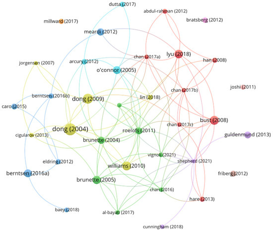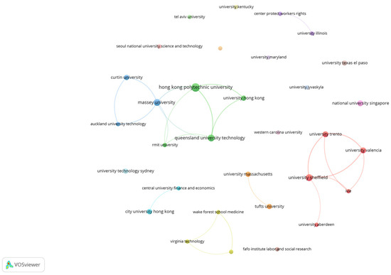 Collaboration between research institutions encourages innovation, facilitates knowledge exchange, and addresses complex global challenges [36]. Constructing a collaboration map of research institutions can reveal which institutions actively engage in research related to MCWs and encourage further intercooperation. Using VOSViewer with a minimum publication threshold of 2, 32 out of 170 institutions were selected for visualization (see Figure 7). The institutions with the highest number of papers are the Hong Kong Polytechnic University (N = 8), University of Sheffield (N = 5), Queensland University of Technology (N = 5), and Massey University (N = 5), which also lead in citation counts. Hong Kong is home to several universities that are involved in migrant worker studies, including the City University of Hong Kong, Hong Kong Polytechnic University, and the University of Hong Kong.