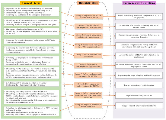 The significance of this review lies in its capacity to consolidate fragmented research efforts and provide a holistic understanding of what has been accomplished and what remains to be conducted for MCWs in the global construction industry. The critical knowledge gaps are addressed by presenting a comprehensive overview of the literature, and researchers and policymakers are equipped with the insights necessary to formulate more cohesive and effective strategies to improve the working conditions, safety, and integration of MCWs. Additionally, congruent with the United Nations’ Sustainable Development Goals (SDGs) 3, 8, and 10, this review supports global initiatives to promote sustainable and inclusive work environments. It also contributes to more efficient use of human capital and improving working conditions in the construction sector. This study provides an important foundation for advancing research and policy interventions that will enhance the well-being of MCWs and encourage a more sustainable construction workforce.