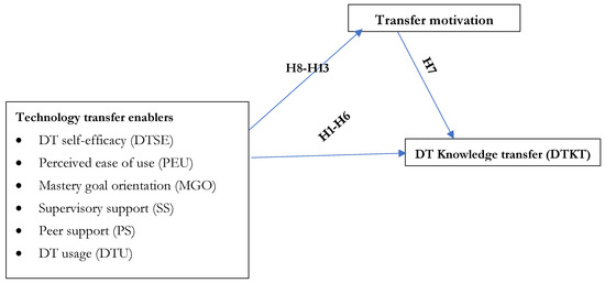 Minbaeva et al. [69] stress the importance of individual employees’ motivations to engage in knowledge absorption and transfer. Similarly, Na-Nan and Sanamthong [82] demonstrated the mediating effects of workplace support, transfer motivation, and transfer of training on the relationship between the self-efficacy and job performance of engineering alumni. In essence, transfer motivation could act as a mediator in the knowledge transfer process, influencing the extent to which knowledge is effectively applied. This is a microlevel (individual) consideration, as knowledge fundamentally resides in people and they may choose to share it or not [81]. In the context of the current study, digital technology end-users’ motivation is explored to provide an understanding of how this can lead to more efficient knowledge-sharing and application within AEC organisations. Its significance as a mediating effect on the digital knowledge transfer process is hypothesised as follows: