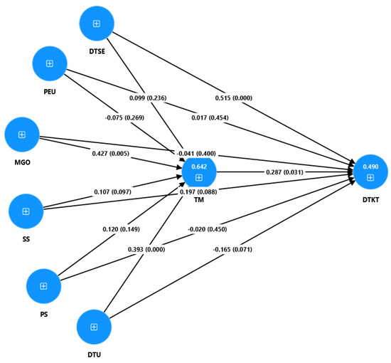 The validity and reliability of the measurement instrument were tested using the relevant evaluation criteria provided by the PLS-SEM calculation. Composite reliability (CR) and Cronbach’s alpha values were calculated for evaluating the internal consistency reliability of the measurement models, and the results were satisfactory. However, four items (DTU1, MGO1, PEU2, PS2) indicated a high risk of multicollinearity by large VIF values (greater than 5) and hence were deleted (Appendix A). The results of the finalised models are provided in Table 1 and Table 2. According to the results in Table 1, the CR and Cronbach’s alpha values of all the eight constructs were above 0.7, the minimum threshold. Hence, internal consistency was established for the modified measurement models. The AVE and CR measures were considered for the convergent validity assessment. The CR values were already satisfactory, and all the AVE values were greater than the minimum recommended value of 0.5. Therefore, convergent validity of the measurement model of each construct was adequately confirmed. In assessing the discriminant validity of the constructs, the HTMT ratio was used based on its higher quality relative to the alternative criteria [85]. All the HTMT ratios of the measurement variables shown in Table 2 were below the recommended maximum of 0.9 [85], indicating a satisfactory level of discriminant validity.