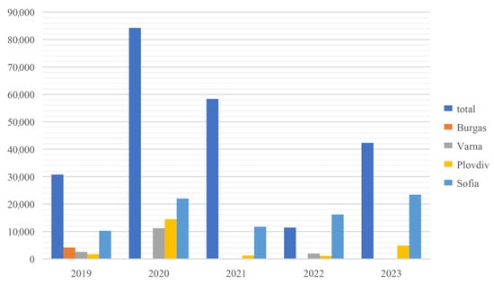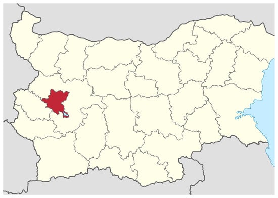 The Republic of Bulgaria on the map of Europe and the Sofia Municipality are highlighted in red in Figure 1 and Figure 2 [42,43]. Sofia Municipality has a population of 1,274,290, according to the latest population and housing census in 2021 [44], which accounts for 19.54% of the total population of the Republic of Bulgaria. Covering an area of 1349 km2, it is the second-largest municipality in Bulgaria [44]. It is the only municipality in the Sofia Region. The capital of the municipality is Sofia, the largest Bulgarian city, with 1,183,400 inhabitants [44].