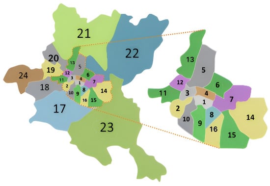 According to the provisions of the Law on the Territorial Division of Sofia Municipality and Large Cities [45], Sofia Municipality is divided into 24 administrative districts, as shown in Figure 3 [46].