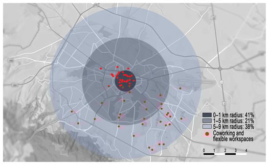 The points marked in red on Figure 4 illustrate the location of these spaces on the map of Sofia Municipality. It was observed that the majority of the spaces are located within walking distance from the city center, within a 1 km radius—27 spaces in total. This is followed by 25 spaces located 5 to 9 km from the city center. Only 16 coworking and flexible workspaces are situated within a 1 to 5 km radius.