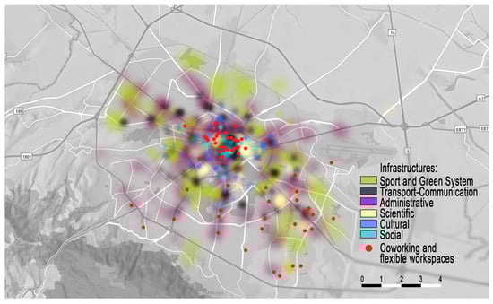 Figure 5 clearly highlights the proximity of coworking and flexible workspaces to specific clusters of interest, including transportation and communication infrastructure, green spaces and sports facilities, cultural sites, administrative services, social infrastructure, and scientific.