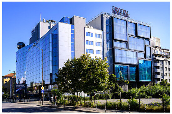 - Photo of Crystal Business Center. Available online: https://crystalcorp.bg/service/image?VWI4R3hRY210R1B4YmxzUlpUSkFJd1VIdHVlUG5TVS9xaFNJa0xMUmp1dGJsVzF2U2hBVisvTEo0TTZCdUUvLw (accessed on 20 January 2025).