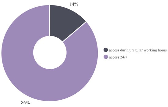 In terms of access, 57 coworking spaces and flexible workspaces are available 24 h, seven days a week, and only 9 are open during the standard hours 9 a.m.–5/6 p.m. (Figure 12).