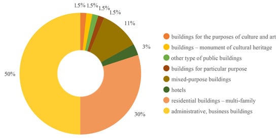 Coworking spaces and flexible workspaces are situated in buildings serving various purposes. The buildings in the territory of the Republic of Bulgaria are classified according to the Classification of the Types of Construction for Buildings, Technical Infrastructure Facilities, and Independent Units, as specified in Annex 4 to Article 16 (3) of Ordinance No. PД-02-20-5 on the content, creation, and maintenance of the cadastral map and cadastral registers [105]. Figure 14 illustrates coworking and flexible workspaces located in buildings with the following uses: