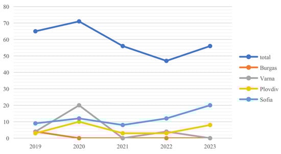 The research revealed that within a period of 12 years, from the inauguration of the first coworking location in the city of Sofia in the administrative district of Lozenets in 2012, by the end of October 2024, there were 66 active coworking spaces and flexible workspaces in Sofia Municipality. The number of spaces in the next three largest cities in Bulgaria—Plovdiv, Varna, and Burgas—are significantly fewer than those in the capital [56,57,58]. In the capital, 31 spaces are operated by single-location operators, and 11 spaces are operated by multi-location operators.