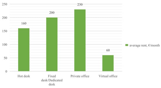 The first coworking space was established in 2005 in San Francisco, USA, by Brad Neuberg [20]. He introduced a novel workplace concept that addressed the limitations of traditional office spaces and working from home. Similar spaces emerged around the same time in Europe, primarily in Germany and Austria [21]. In urban agglomerations and major European cities, coworking spaces are no longer a novelty and are experiencing dynamic growth [21]. With approximately 148 operators, Europe boasts 6850 coworking spaces, with an expected annual growth rate of 4.7% [22]. According to Coworker, one of the largest online platforms for discovering and booking coworking spaces and flexible workspaces worldwide, 11,121 spaces are registered across Europe [23]. The growth of coworking spaces and flexible workspaces is driven by the high level of user interest in the services they offer. Customers have the flexibility to book desks, meeting rooms, small offices, or comfortable “on-demand workspaces” [24]. The shift toward hybrid working practices during the COVID-19 pandemic prompted many large office-space providers to adapt their offerings, incorporating flex-spaces with a coworking component [25].