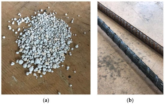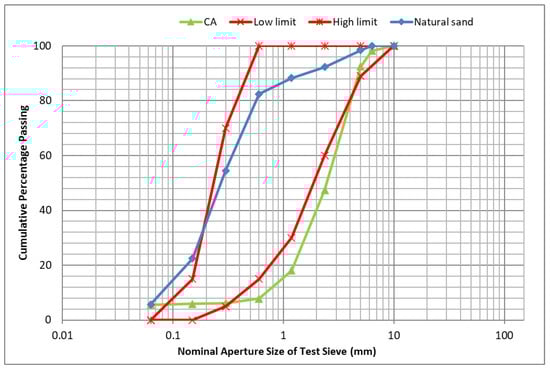 The concrete mixture utilized natural coarse aggregate (NCA) with a maximum dimension of 10 mm, and fine aggregate sourced from the Thames River (i.e., natural sand) with a maximum dimension of 5 mm. Figure 1 displays the particle size distribution curves for both CA and natural sand, along with the upper and lower limits outlined in BS EN 933 []. It is noteworthy that the CA curve closely aligns with the lower limit prescribed by BS EN 933 []. Table 1 displays the particle density and water absorption rates of NCA, natural sand, and CA, as per the specifications outlined in BS 812 []. As expected, CA demonstrated a lower saturated surface dry density (SSD) and a notably higher absorption ratio compared to NCA and natural sand. Figure 2a illustrates the CA used in this study.