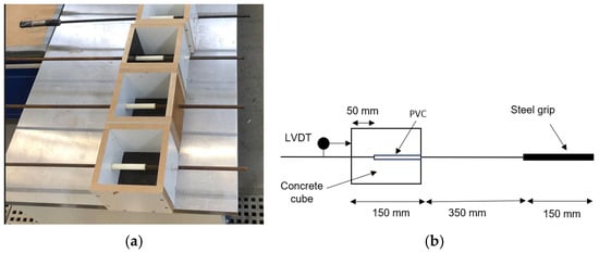 The bond interaction between the rebars and concrete was assessed through direct pull-out tests, adhering to the ACI 440.3R-04 standard [], using a 150 mm cube mould. The reinforcement used in this research was Basalt FRP and steel, both with 10 mm nominal diameters (Figure 2b). The bond length was taken as 50 mm (five times the bar diameter). One hundred-millimetre-length polyvinyl chloride (PVC) pipes were placed to segregate the concrete and the bars, as illustrated in Figure 3. The bars were positioned vertically inside the mould and in the middle of the specimen, and the concrete was poured. The specimens were left to cure for 24 h in a curing room, along with five additional concrete cubes for compressive strength testing. After that, the pull-out specimens were removed from the mould and cured until the day of testing. Three pull-out specimens were prepared and tested for each CA percentage (0%, and 25%), and type of the bar (steel or BFRP) was cast and tested. In total, nine specimens were tested.