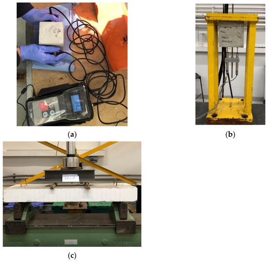 In order to assess the concrete’s density, homogeneity, and internal integrity, an ultrasonic pulse velocity (UPV) test was conducted on each fully cured concrete cube, preceding the compression test (Figure 5a). This UPV test followed the direct transmission method detailed in BS EN 12504-4 []. During this examination, the recorded “T” (in microseconds or μs) represented the time it took for a pulse to traverse the length of the specimen, which measured 100 mm, between the transmitting transducer and the receiving transducer. This recorded time, in turn, was used to calculate the wave pulse velocity denoted as “V” (in kilometers per second or km/s), achieved by dividing the pulse’s distance by the transit time.