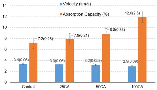 The UPV results shown in Figure 6 indicate that the quantities of CA in the concrete mix have a significant impact on its density, porosity, and ability to transmit ultrasonic waves. Figure 6 displays the average values of the measured velocity, with the corresponding standard deviation values shown within parentheses. The results showed that pulse velocity PV reduces as the replacement ratio of CA increases. For instance, the PV for mixes with 50% and 100% CA is 4.5% and 13.3% lower than that for the control mix. The CA is a lightweight and slightly porous material, as shown in Table 3, resulting in a reduction in the UPV. There is generally an inverse relationship between UPV and absorption capacity. A similar observation was made by Räsänen et al. [], where lower UPV values for brick samples were found to correspond to a higher water absorption capacity. The increase in porosity and voids due to the addition of CA is responsible for slowing the speed of the pulse wave, hence lower UPV values. A similar observation was found by Raza et al. [], where the use of porous aggregates (e.g., recycled aggregates) noticeably reduces the pulse velocity, hence the quality of concrete degrades. The absorption capacity of the concrete increases with CA percentage increases. For instance, the absorption capacity of the mixes 50 CA and 100 CA is 22% and 65% higher, respectively, than that for the control mix. High absorption capacity for mixes with high CA contents is associated with high porosity of the aggregates.