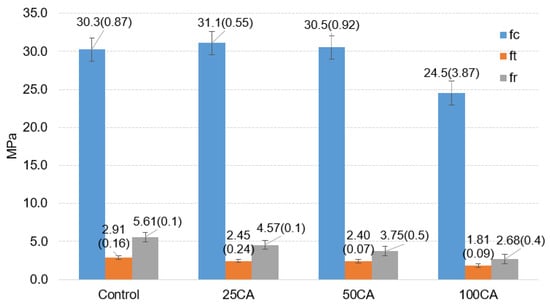 Figure 7 illustrates the compressive strength (fc), splitting tensile strength (ft), and rupture strength (fr) of concrete mixes after 28 days. Figure 7 displays the average values of the measured data, with the corresponding standard deviation values shown within parentheses. Results showed that 25% and 50% CA replacement increased the compressive strength by 3% and 1%, respectively, when compared to the control. Thereafter, at 100% replacement, there was a 19% decrease in strength in comparison to the control mix. When reviewing the particle distribution of NS and CA in Figure 1, NS was closer to the lower limits of the standards, while CA was closer to the upper limits of the standards. As the replacement levels increased, therefore, the particle distribution was more evenly distributed, which resulted in more pores being filled and, therefore, comparable/greater strengths at 25% and 50% replacement. At 100% replacement, the increase in CA leads to a greater quantity of larger particles, which resulted in a higher fineness modulus and created a mix in which the workability was decreased.