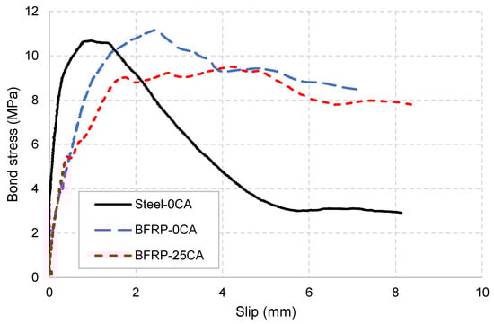 Figure 8 shows the bond-slip response obtained for steel and BFRP samples with different carbonated aggregate contents. The figure effectively illustrates the earlier observations in terms of the ultimate bond stress and the corresponding slip values. Clearly, both steel and BFRP samples have shown similar bond strength when 0 CA is employed, while a lower bond strength is attained for BFRP samples with 25 CA. In general, the BFRP samples demonstrate lower initial stiffness and greater slip at the ultimate bond stress compared with that of steel. This could be attributed to the type of the BFRP fibre and the inherent lower modulus of elasticity of the BFRP (i.e., 49 GPa) compared with that of steel reinforcement (i.e., 200 GPa) [,,]. This results in reduced stiffness in the bond–slip curve, as presented in the figure. Moreover, the BFRP samples exhibit an obvious difference in the response in the softening stage. After reaching the ultimate stress, the bond–slip curve exhibits a steady and gradual decline response, showing further slip without great reduction in the bond stress. In contrast, the steel samples show a sharper response after the ultimate bond stress is reached, characterized by a greater reduction in the bond stress and a lower level of slip. There is no significant difference in the softening response when the percentage of carbonated aggregate is increased to 25%. It is obvious that BFRP samples demonstrate a greater level of residual bond stress compared with steel samples. This is in line with previous observations reported in the literature []. This is mainly owing to different mechanical interlocking mechanisms, as well as different surface textures and compositions, which improve the adhesion property with the surrounding concrete, leading to an increase of the bond interface and accordingly higher residual bond stress []. In addition, other distinctive mechanical properties of the BFRP, including the high tensile strength, contribute to sustaining the bond stress even beyond the yielding limit.
