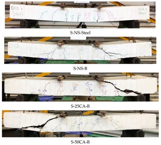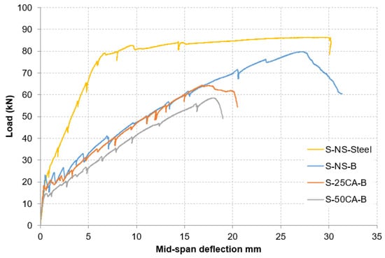 Figure 10 shows a view of the crack patterns at failure for the slabs S-NS-Steel, S-25CA-B, S-50CA-B, and S-50CA-B. After reaching the cracking load, an initial crack initiated at the bottom of the slab in the region between the mid-span of the slab and point of load application. With an increasing load beyond the initial cracking point, more flexural cracks developed and extended vertically upward toward the compression zone. As the load continued to rise, some cracks also appeared in the shear region and propagated diagonally toward the point load application. At the ultimate load, the steel RC slab failed by steel yielding, indicating flexural failure. For BFRP RC slabs, as the loading increased, new cracks continued to form in the shear span, while the existing cracks widened and propagated diagonally toward the top of the slab. These shear cracks joined and caused a shear failure. The cracks in the BFRP slabs were longer and wider than those in the steel RC slab due to lower elastic modulus of the BFRP than that for the steel.